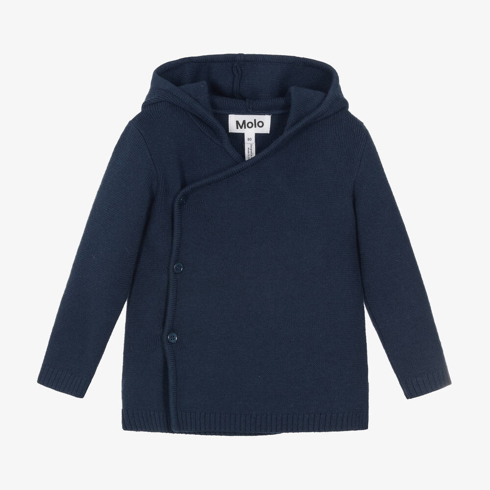 Navy blue hooded cardigan for baby boys and girls by Molo, knitted in a soft cotton and wool blend. This double-breasted style has gently ribbed trims, button fastenings and little 3D ears on the hood for a cute touch. The Danish brand's star tab can be seen on the side seam.