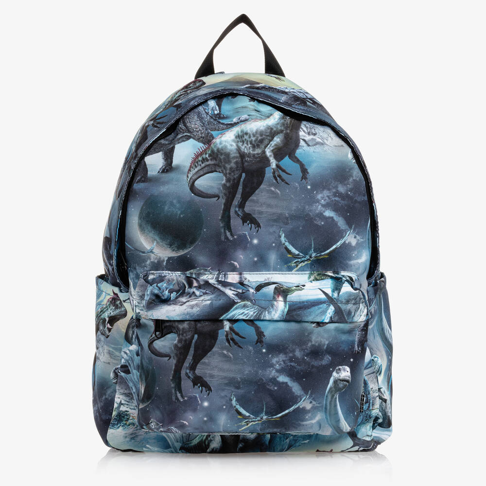 A cool navy blue dinosaurs in space print backpack for boys and girls by Danish brand Molo. Made in durable canvas from recycled sources, it is lightweight and practical for everyday or school. The zip-fastening roomy main compartment has a padded back and internal slip pocket to store a laptop or tablet. There are two external side pockets, a zipped front pocket and a carry handle. Adjustable for a good fit, the padded shoulder straps come with a chest strap that helps distribute the weight evenly.