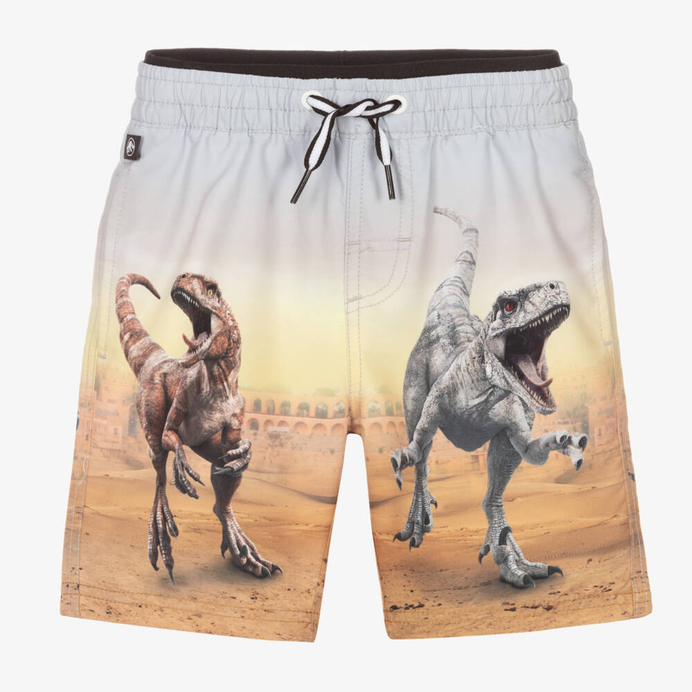 Light blue swimming shorts for boys by Molo, with a print of two dinosaurs with a plane flying overhead. As part of the Jurassic World collaboration, these swim short have a UPF50+ rating and are made from recycled polyester. They have a mesh lining for comfortable wear, handy side pockets and an elasticated drawstring waist with an internal elasticated waistband.