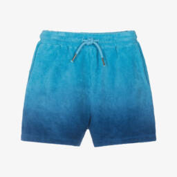 Blue shorts for boys and girls by Molo, designed with a cool ombré effect. Made in soft organic cotton towelling for comfortable wear, this casual style has slanted front pockets and a back patch pocket, trimmed with the designer's logo tab. The elasticated waistband has drawstring ties for an adjustable fit.