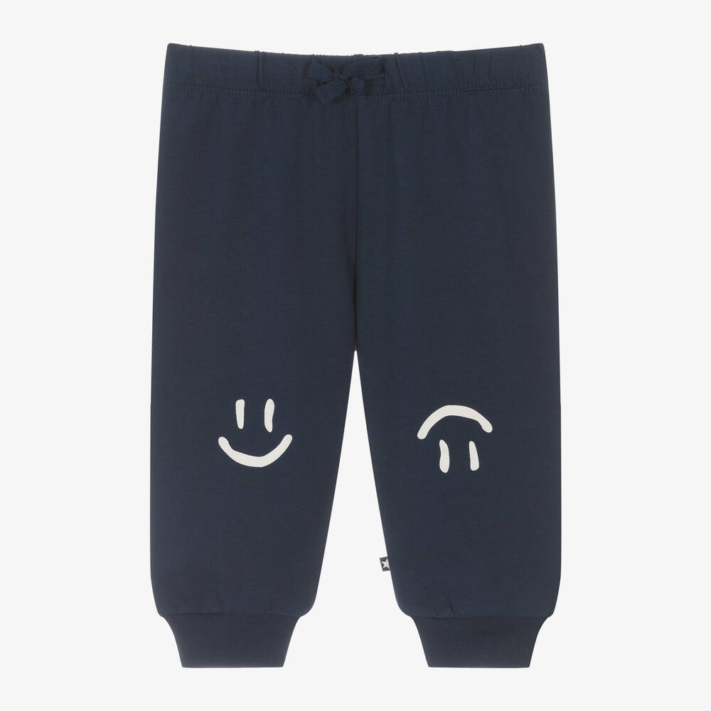 Navy blue joggers for little boys and girls by Danish brand Molo, with white smiling faces printed on the front. Casual and comfortable, they are made in soft organic cotton jersey, with a cosy fleecy inside. There is an elasticated drawstring waist, gently ribbed ankle cuffs, and a small logo tab on the side seam for a subtle designer finish.