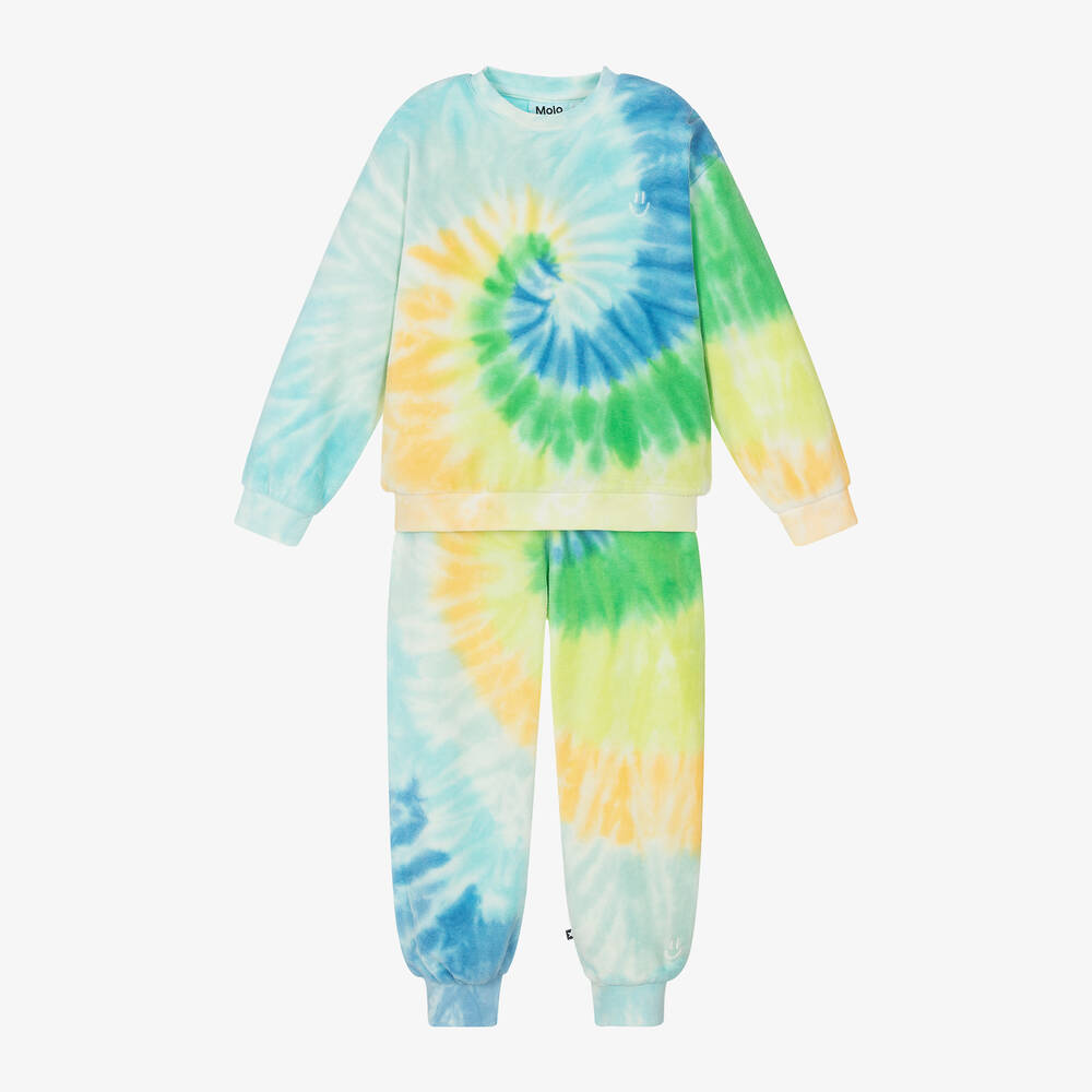A blue, green and yellow tracksuit for boys and girls by Molo, made from soft organic cotton towelling. Both items are patterned in a vibrant tie-dye design with an embroidered smiling face for a fun, contemporary look. Great for lounging in, the long-sleeved sweatshirt has poppers on one shoulder and the joggers have an adjustable drawstring waist.