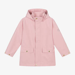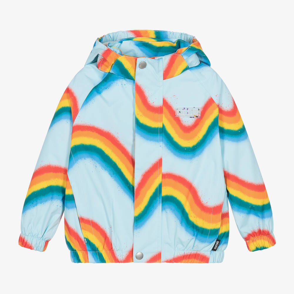 Lots of fun, this pale blue rain jacket for boys and girls by Molo is patterned with a bright and colourful rainbow design. Super smooth with a mesh lining, this lightweight jacket is breathable and water repellent, ideal for layering on rainy days. Fastening with a zip, it has a velcro and popper-fastened storm placket and chin guard for added protection. There are discreet pockets on the front, elasticated cuffs and hemline, and a detachable hood for an alternative style. A reflective star motif can be found on the back for enhanced visibility, and there is a transparent logo patch on the chest for a branded finish.