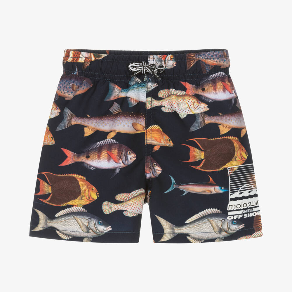 Navy blue swim shorts for boys from Danish brand Molo, with UPF 50+. Silky smooth they are lined with soft mesh for added comfort, and the elasticated waist can be adjusted via drawstring for a better and more secure fit. To stand out from the crowd, they are printed with a bold and colourful fish print along with a white surf-themed logo on the leg.