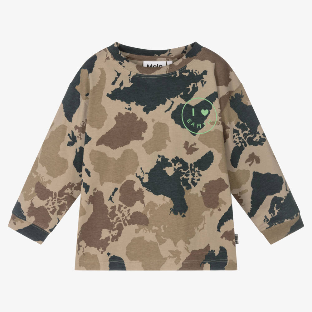 Beige, brown and grey top for boys by Molo, made in mid-weight, organic cotton jersey. With casual ribbed trims, the all-over continent print resembles a cool camouflage design. It is finished with a contrasting green print on the chest, surrounding an 'I love Earth' slogan.
