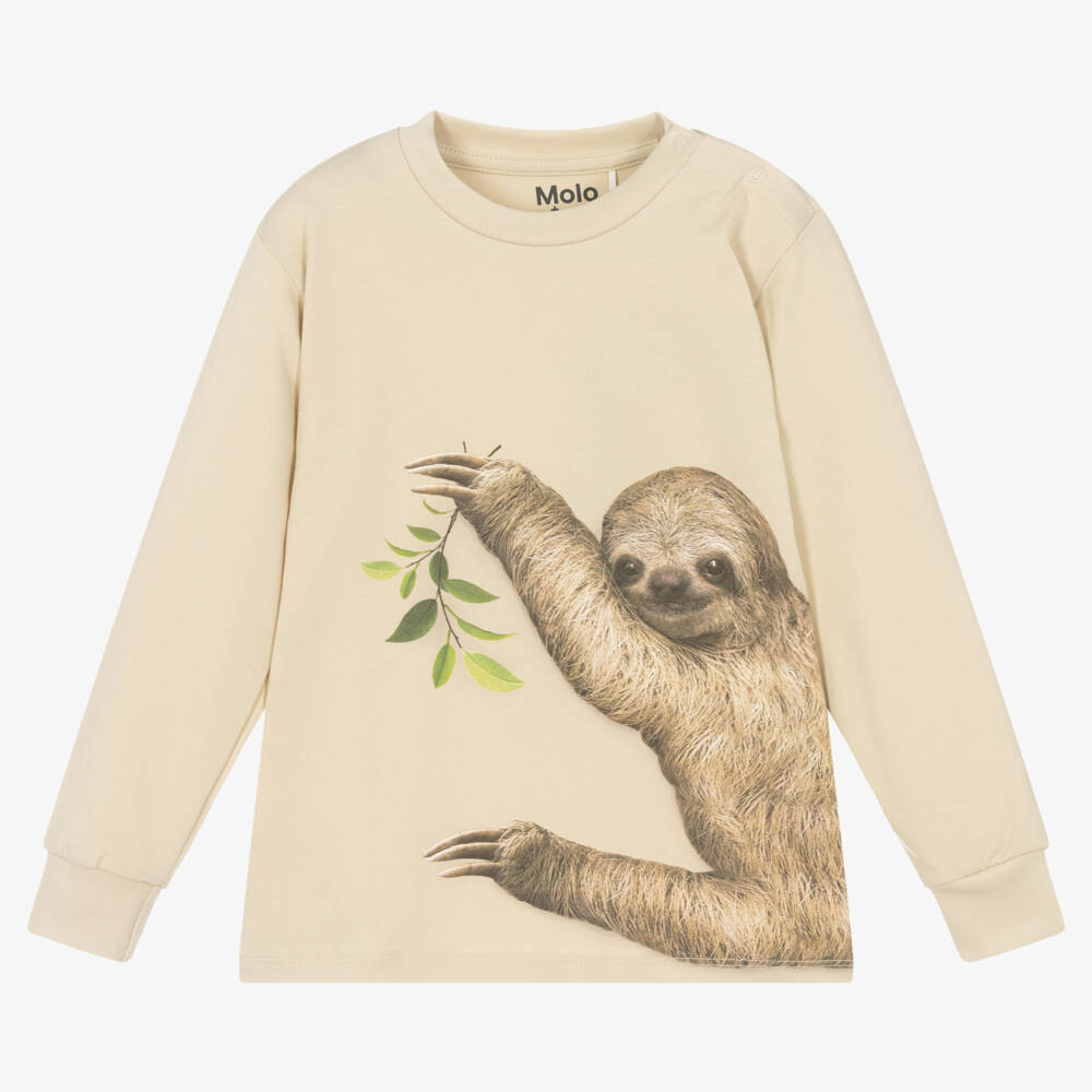 Boys long sleeved beige top by Molo, made in soft organic cotton jersey. Fastening with simple poppers on one shoulder, it has a cute sloth print on the front and back for a quirky look.
