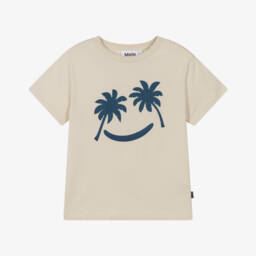 Pale beige organic cotton T-shirt for boys by Molo, with a cool smiling palm tree face in contrasting blue. Casual and comfortable, this relaxed fit jersey tee has a crew neckline and short sleeves.
