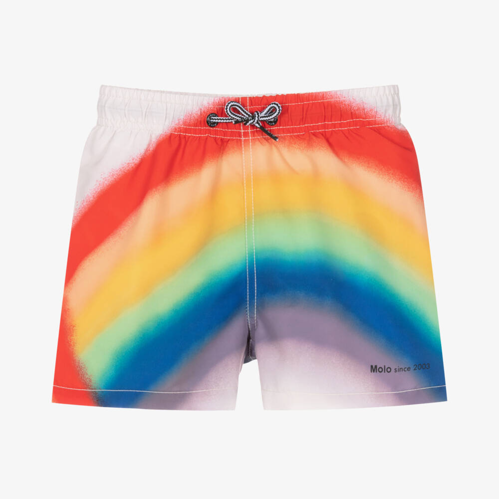 Beige and red UPF 50+ swim shorts for boys by Molo, brightening up swimming days with all of the colours of the rainbow. Silky and lightweight with a mesh lining, they have a black and white drawstring on the waist and rubber logo stamped on the back for a branded finish.