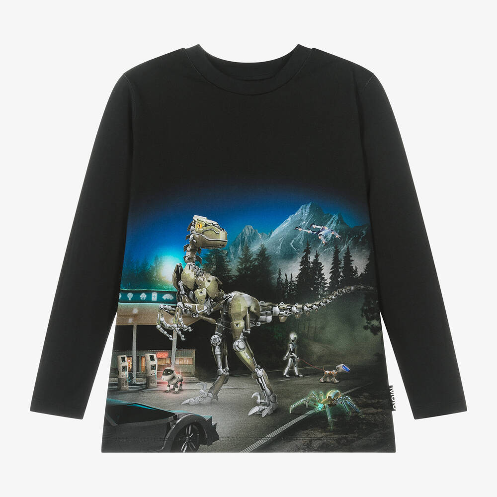 Black organic cotton top for boys from Molo, in a relaxed fit. The front features a futuristic dinosaur, spider and dog print, a cool design fit for robot-lovers. Made in soft jersey, this long-sleeved top offers comfort for everyday wear.