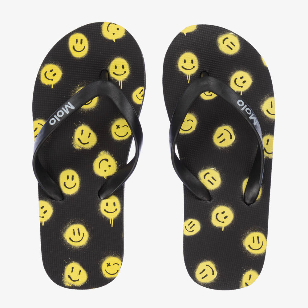 Black flip flops for boys by Molo. Made in flexible rubber, the base is printed with a yellow happy face design. Great for the beach or the pool, they have black logo straps for comfortable wear and ridged soles.