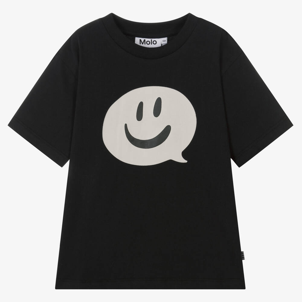Boys black organic cotton T-shirt by Molo, printed with a fun happy face speech bubble graphic in white, on the front. Made from soft, breathable jersey, this crew neck top is comfortable and easy to wear.