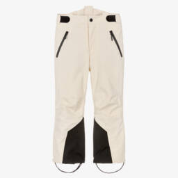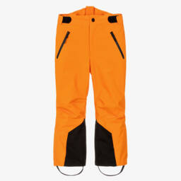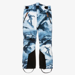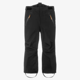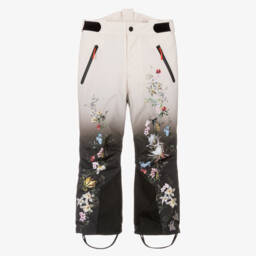 These black ski trousers with moon print for boys by Molo, are designed for optimal performance. They are made in durable, recycled fabric, with a soft fleece lining for warmth. Waterproof, windproof and breathable, they have taped seams to ensure the wearer remains dry. They have adjustable ankles to ensure a secure fit over boots and detachable rubber stirrups for added protection. The moon print is light-reflective for increased visibility in low-light conditions. Zipped pockets and an adjustable waist ensure practicality for adventures on the slopes.