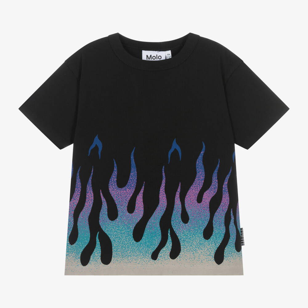 A black short-sleeved T-shirt for boys by Molo, made from soft organic cotton jersey. Cool and contemporary, it is printed with flames in purple, blue and beige for a fun streetwear look.