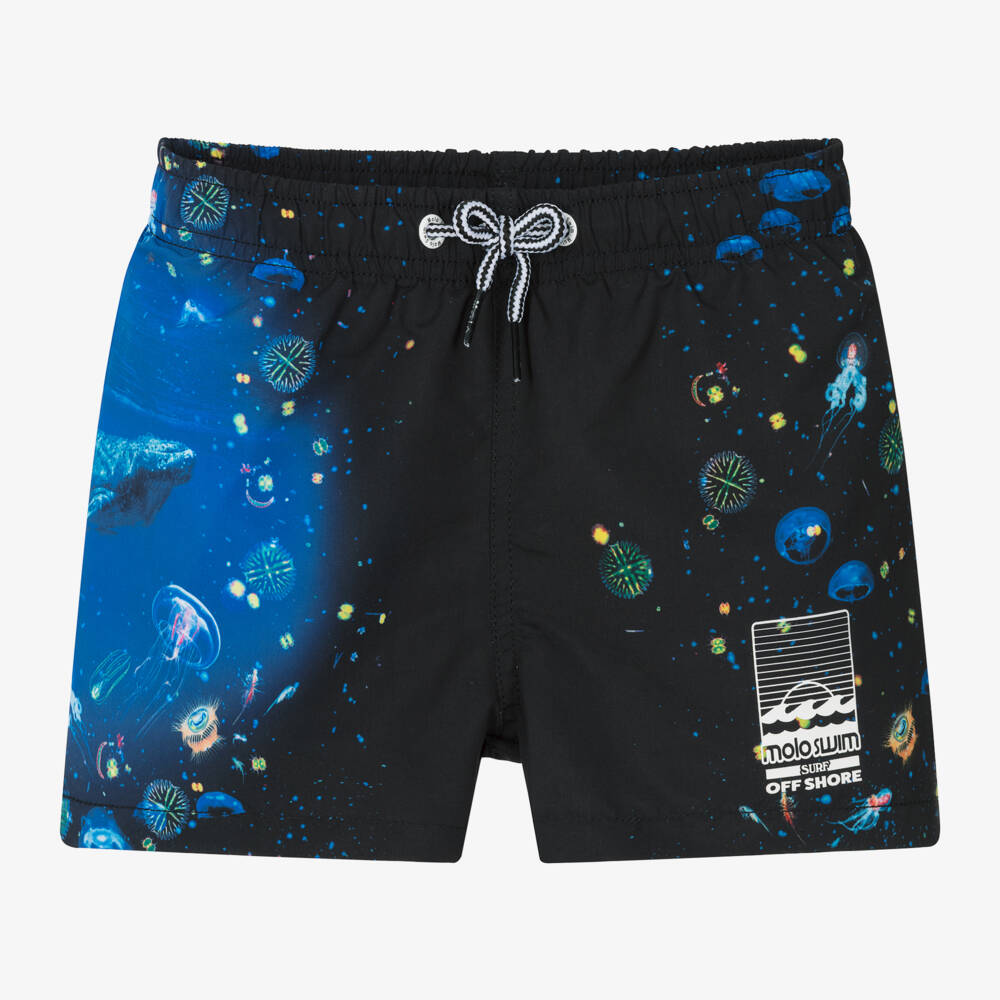 Black UPF 50+ swim shorts for boys by Danish brand Molo, with a blue ocean print, including a whale, squid and colourful jellyfish. Silky smooth and lightweight, they are lined in soft mesh for comfort, with a drawstring waist for an adjustable fit and a faux pocket on the back. To complete the look, there is a surf-themed logo print in white on the front.
