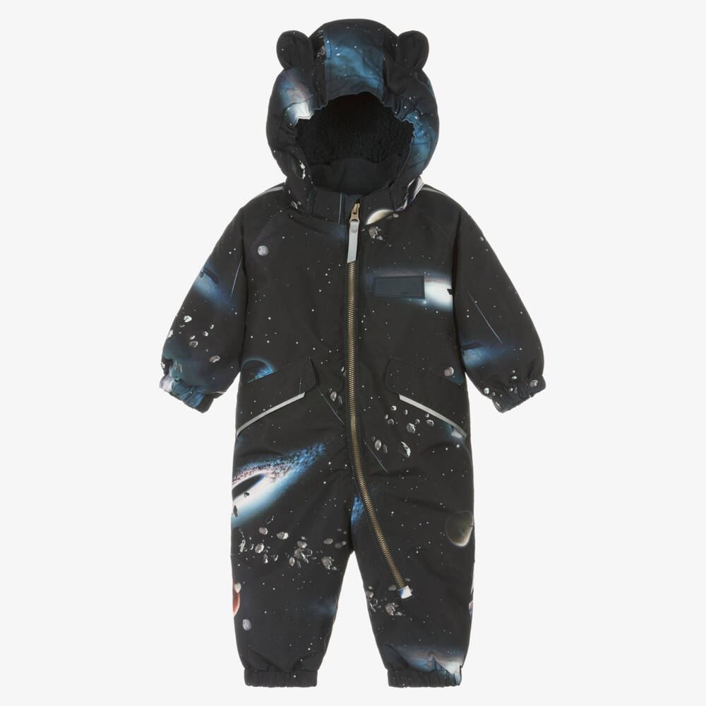 A black space snowsuit for little boys by Molo, with a smooth recycled exterior. This outerwear piece is waterproof, breathable and lightly padded, designed to protect your child in cold weather. It has reflective trims to keep them visible and flap-over pockets. The hood is removable, elasticated for easy dressing and has ears decorated on the top. Zipping up at the front, a polar fleece and silky lining complete the look.
