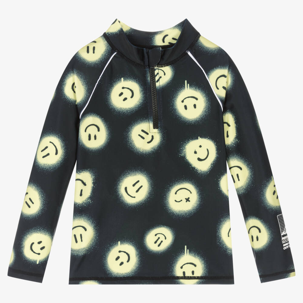 Black UPF 50+ sun protective top for boys from Danish brand Molo. It is printed with bright yellow dots with smiley faces for a fun finish along with a black surf-themed logo on one sleeve. Silky smooth and stretchy, it is ideal for use in the pool or at the beach and a half zip makes pulling it on easier.