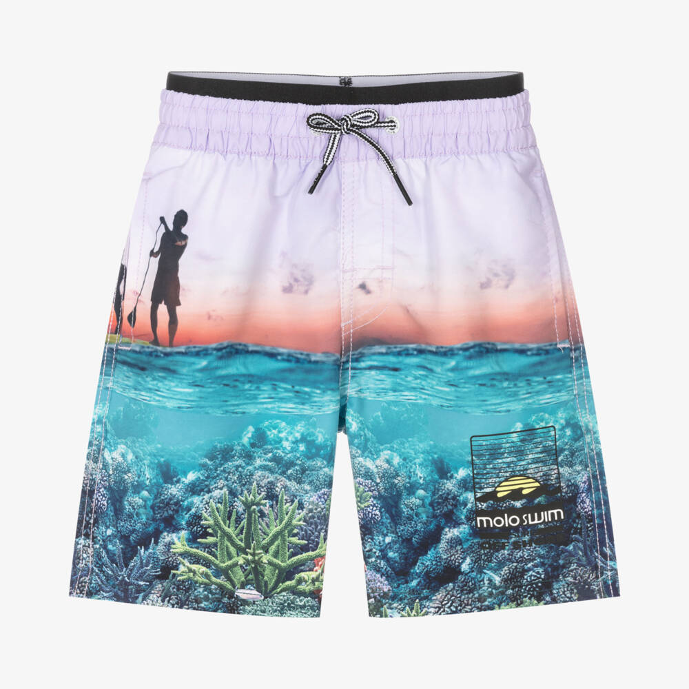 Blue swim shorts for boys from Molo, with a paddleboard theme and a UPF 50+. Silky smooth and lined with soft mesh for added comfort, they have an internal elasticated waistband and can be adjusted with a drawstring fastening for a secure fit. With discreet pockets on the side seams, they have a black, surf-themed logo on one leg.