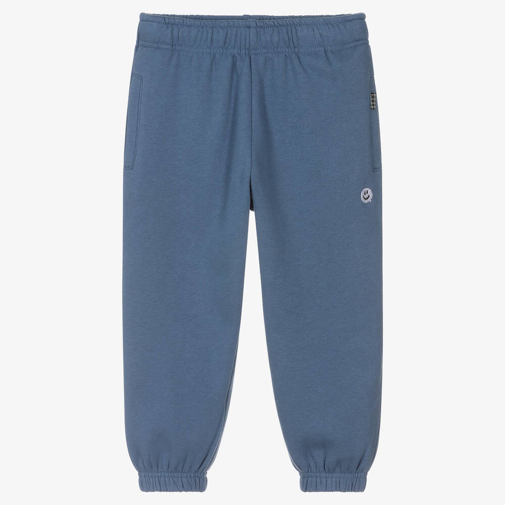 Blue joggers for boys by Danish brand Molo, made from the softest cotton jersey blend. Cool on laid-back days, these comfy joggers have an internal drawstring waistband and side seam pockets. A white smiling face is embroidered on the front for a playful finish.