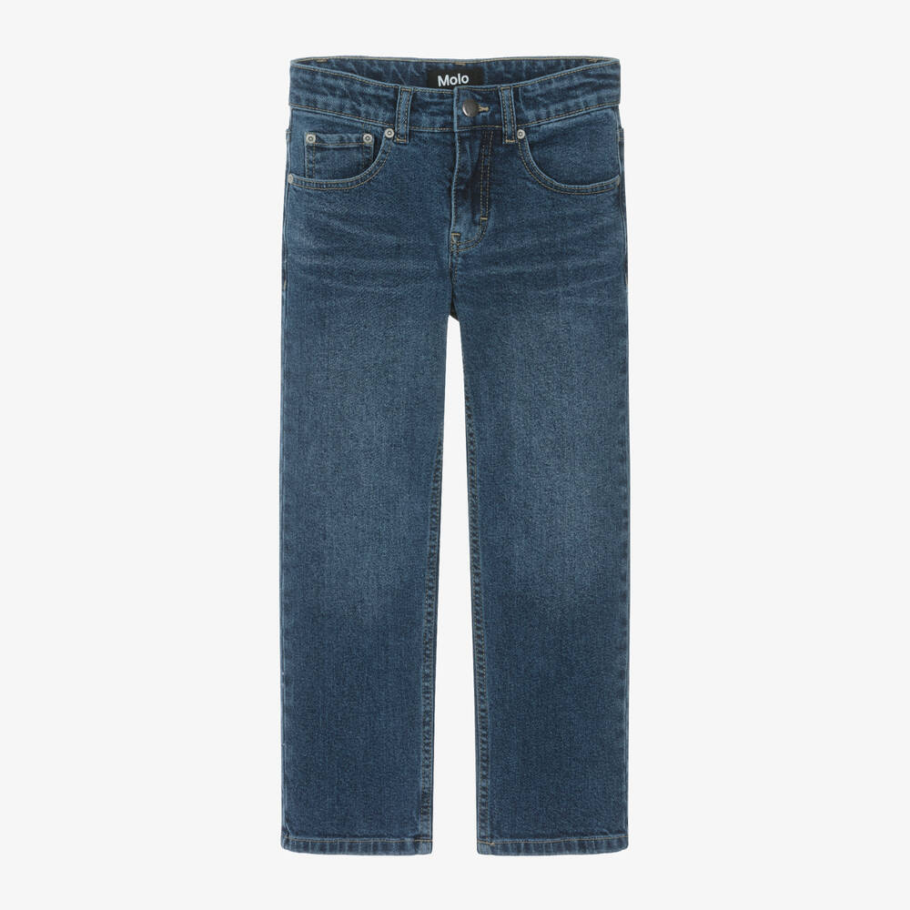 Relaxed-fit jeans for boys by Molo, in blue stone-washed denim. They have five convenient pockets, a front popper and zip closure for quick dressing, and an adjustable waist for the best fit. With a relaxed fit through the leg and thigh, these slightly stretchy jeans are made with organic cotton. The black logo jacron on the back completes the look.