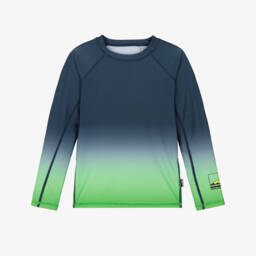 Blue and green swim top for boys by Molo, with a cool ombré effect. Silky smooth and stretchy, it offers UPF50+ sun protection and long sleeves for coverage. Ideal for use in the pool or at the beach, this easy-to-wear style simply pulls on.