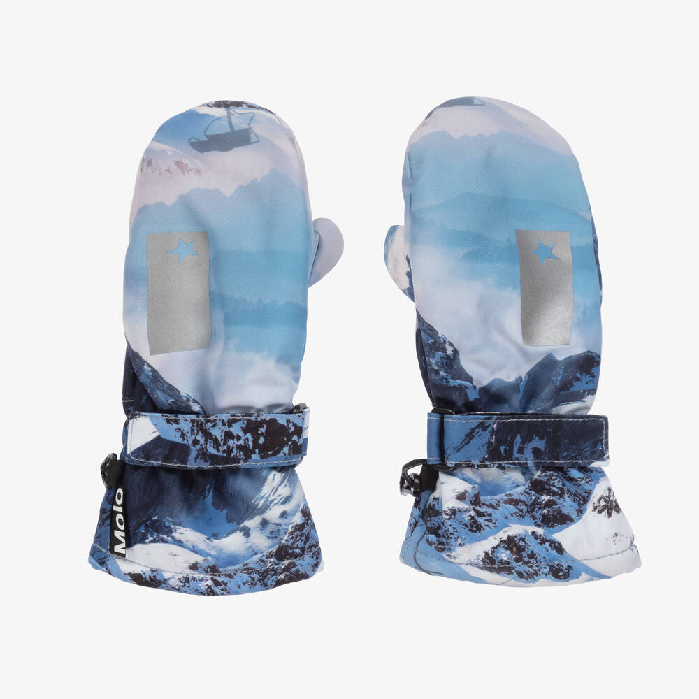 Blue mountain print ski mittens for boys by Molo, with reflective trims for improved visibility on the slopes. Warmly padded with technical insulation, these comfortable waterproof, windproof and breathable mittens are lined in cosy polar fleece. They have long, velcro-adjustable cuffs, a clip to attach them together, and slip-resistant palms for good grip.