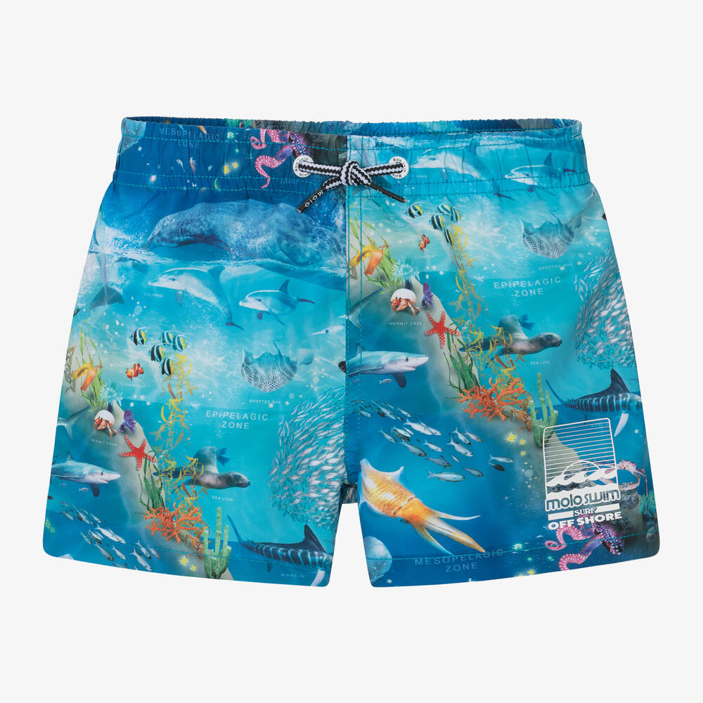 Blue UPF50+ swim shorts for boys by Danish brand Molo, with a cool ocean-themed print. Silky smooth and lightweight, they are lined in soft mesh for comfort, with a drawstring waist for an adjustable fit and a faux pocket on the back. To complete the look, there is a surf-themed logo print in white on the front.