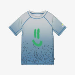 Blue UPF50+ swim top for boys by Molo, featuring an ombre design with a green smiling face and splash print. Made in silky smooth and stretchy jersey, it has overstitch detailing and is easy to wear, simply pulling on.