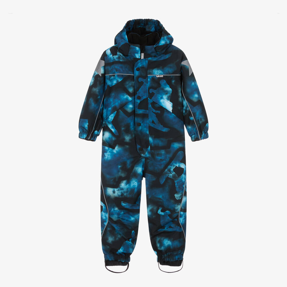 Blue padded snowsuit for boys by Molo, with a tie-dye effect snowboarder pattern and a removable hood. This eco-friendly, high-performance snowsuit is made with recycled materials and is designed to be both waterproof and windproof. Created to outlast the most active lifestyle in the great outdoors, it is warmly padded with breathable yet lightweight insulation. For good visibility, the snowsuit has reflective trim, as well as large reflective star appliqués on the sleeves and legs. It has a cosy polar fleece lining and fastens with a zip beneath a popper flap. Additional practical features include internal carry straps, leg gaiters, detachable stirrups and front pockets.