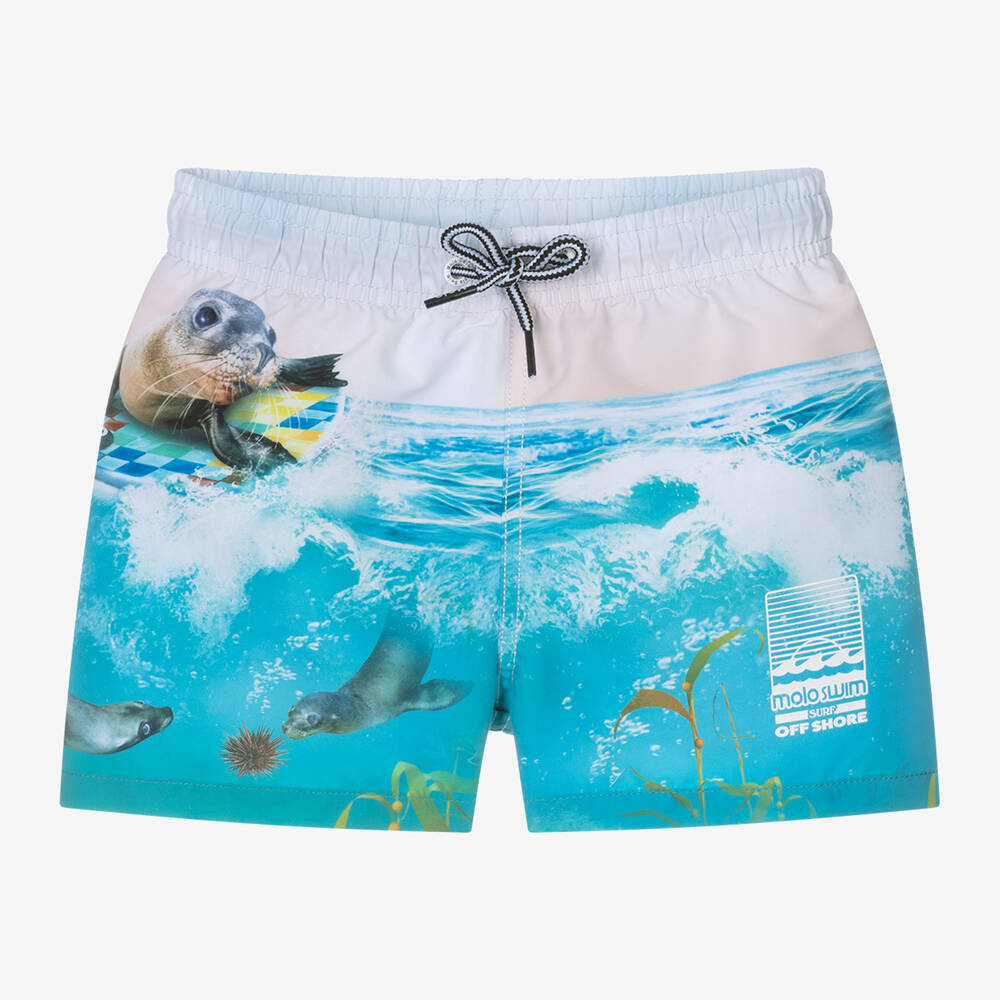 Blue UPF50+ swim shorts for boys by Danish brand Molo, with a cool sea lion print. Silky smooth and lightweight, they are lined in soft mesh for comfort, with a drawstring waist for an adjustable fit and a faux pocket on the back. To complete the look, there is a surf-themed logo print in white on the front.