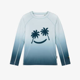 Blue swim top for boys by Molo, with a cool gradient effect and fun smiling palm tree print. Silky smooth and stretchy, it offers UPF50+ sun protection and long sleeves for coverage in the pool or at the beach.