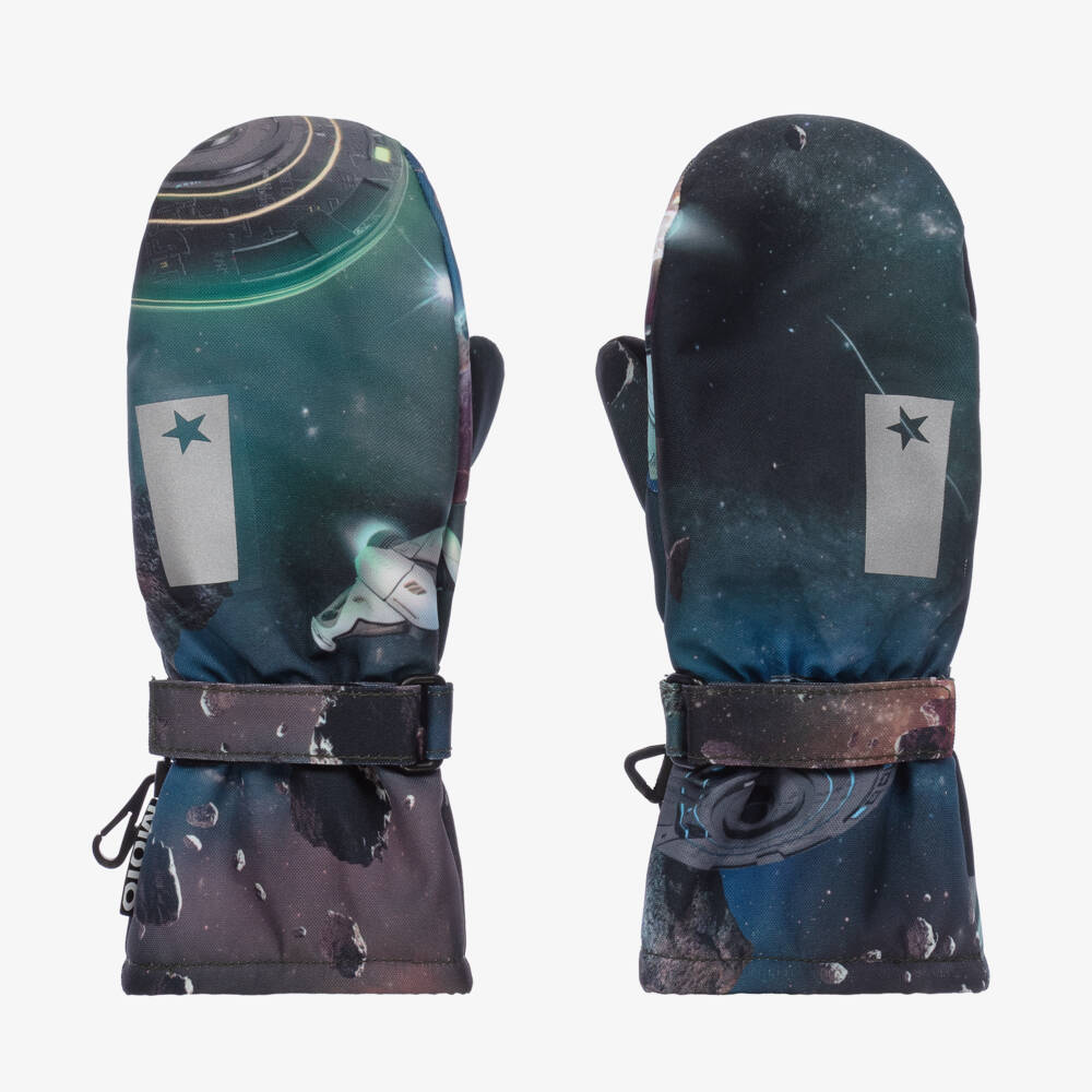 Blue technical mittens for boys by Molo, with a cool space-inspired print. Ideal for outdoor winter activities, they are waterproof, windproof and breathable and feature taped seams, with polar fleece insulated lining for warmth and light reflective prints for better visibility. They have rubbery faux leather palms for additional grip and adjustable velcro wrist straps for a comfortable fit. This product is made from recycled content.
