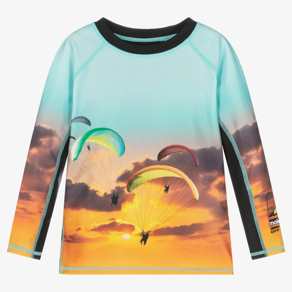 Turquoise blue, orange and black, UPF 50+ sun protective top for boys from Molo. Silky and stretchy, it is ideal for use in the pool or at the beach. To stand out from the crowd, it has a graphic print of parachuters and a sunset sky scene, with a black surf-themed logo on one sleeve.