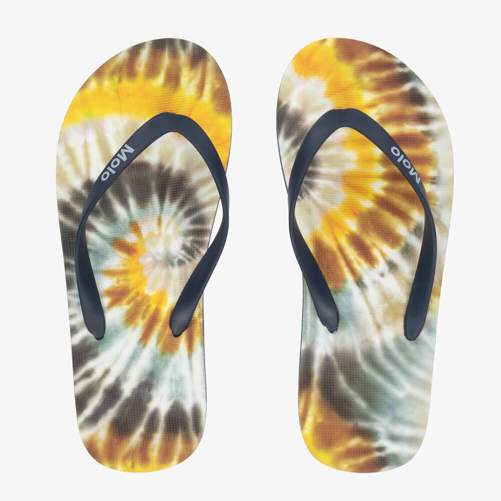 Cool navy blue flip flops for boys, by Molo. Made in flexible rubber, the base is printed with a quirky yellow and grey tie-dye print. Great for the beach or the pool, they have navy blue logo straps for comfortable wear and non-slip ridged soles.