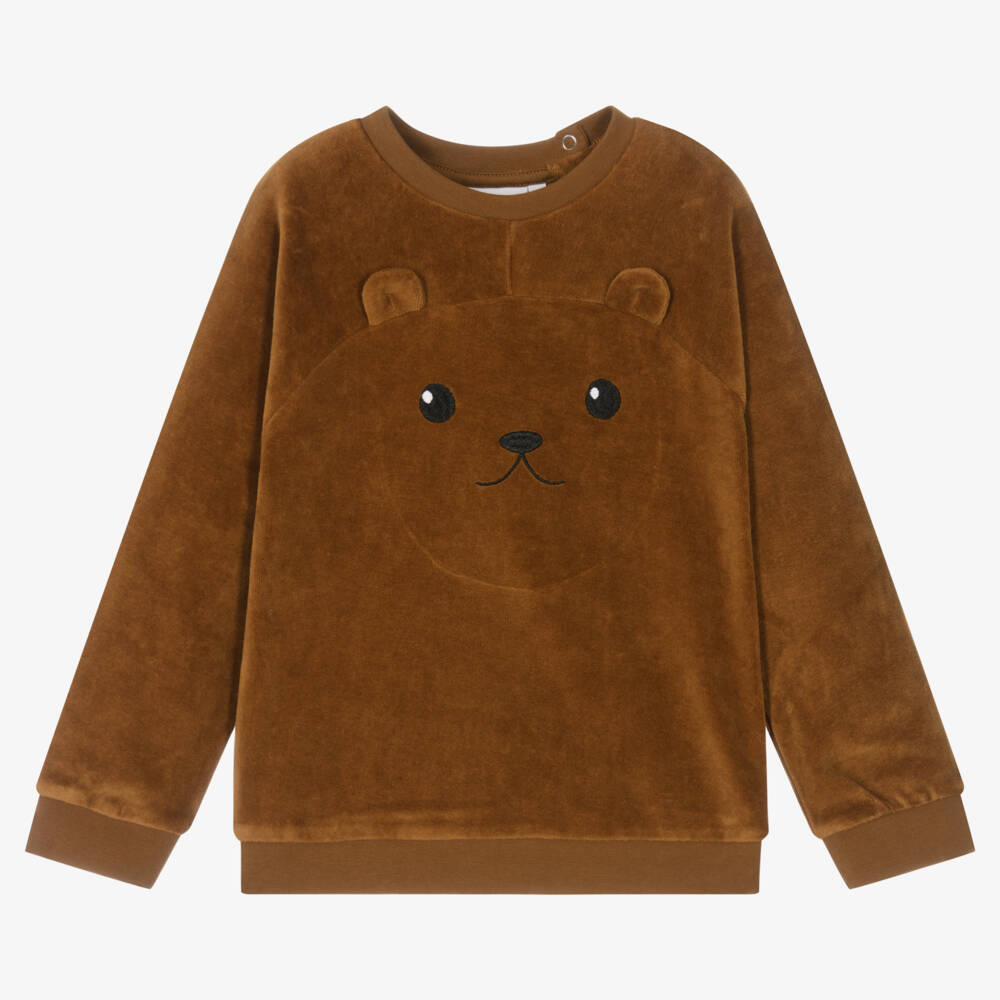 Younger boys golden brown organic cotton sweatshirt by Molo, made in soft cosy velour. Designed with a sweet teddy bear motif on the front, it has a small logo tab on one side for a branded touch and gently ribbed trims for casual comfort.