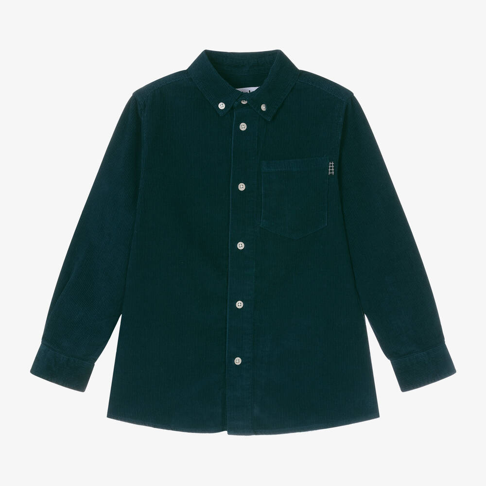 A casual dark green shirt for boys by Danish brand Molo, made in soft cotton corduroy. Worn on its own or as an extra layer, this mid-weight overshirt has a button-down collar, barrel cuffs, and a pleat on the back. There is a woven logo tab on the chest pocket for a discreet designer finish.