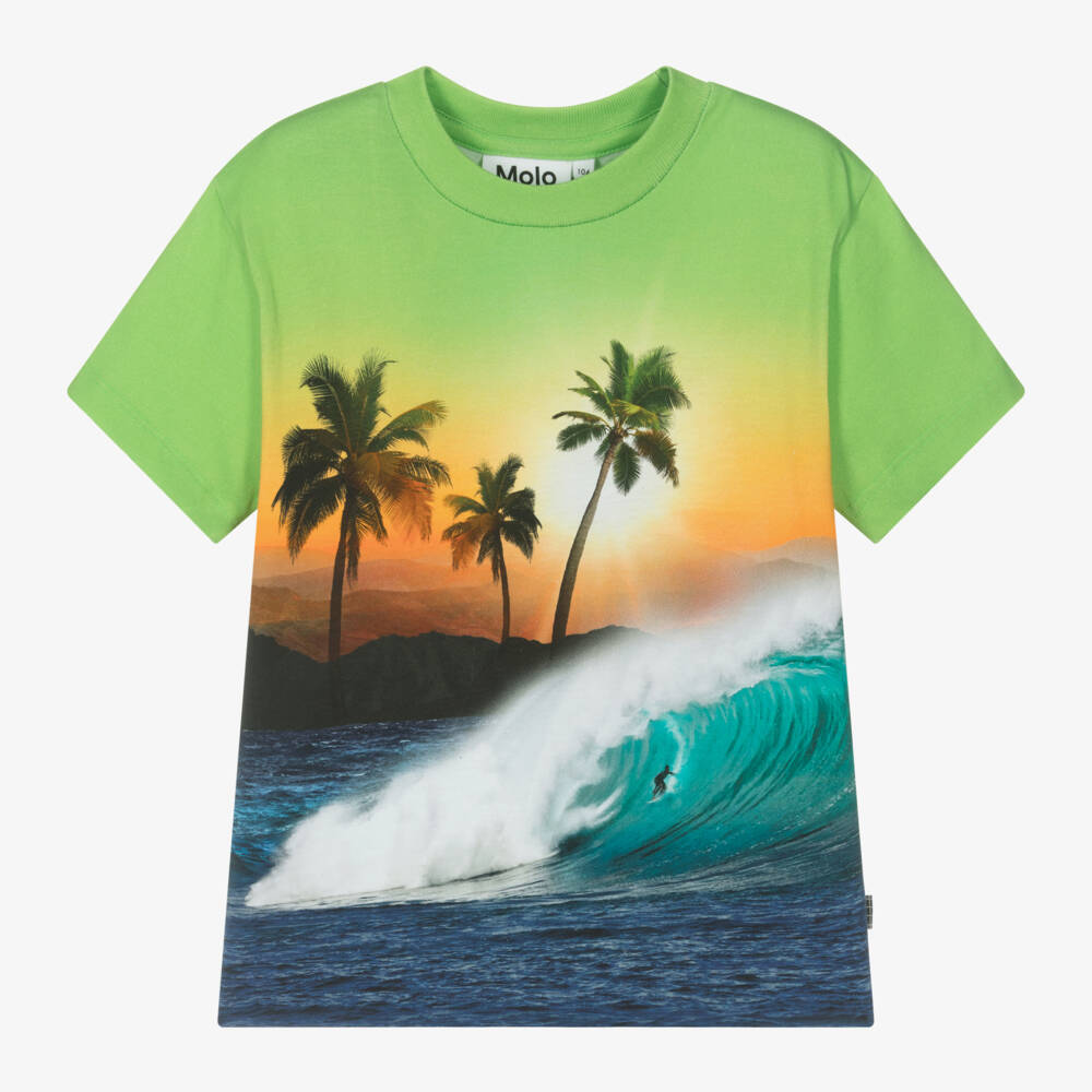 This green and blue organic cotton T-shirt for boys by Molo has a sunset beach scene on the front. Cool and vibrant for boys, the surfboard and palm tree graphic add to the laid-back vibe. Signed with a logo tab, this short-sleeved T-shirt is made in soft jersey for long-lasting comfort.