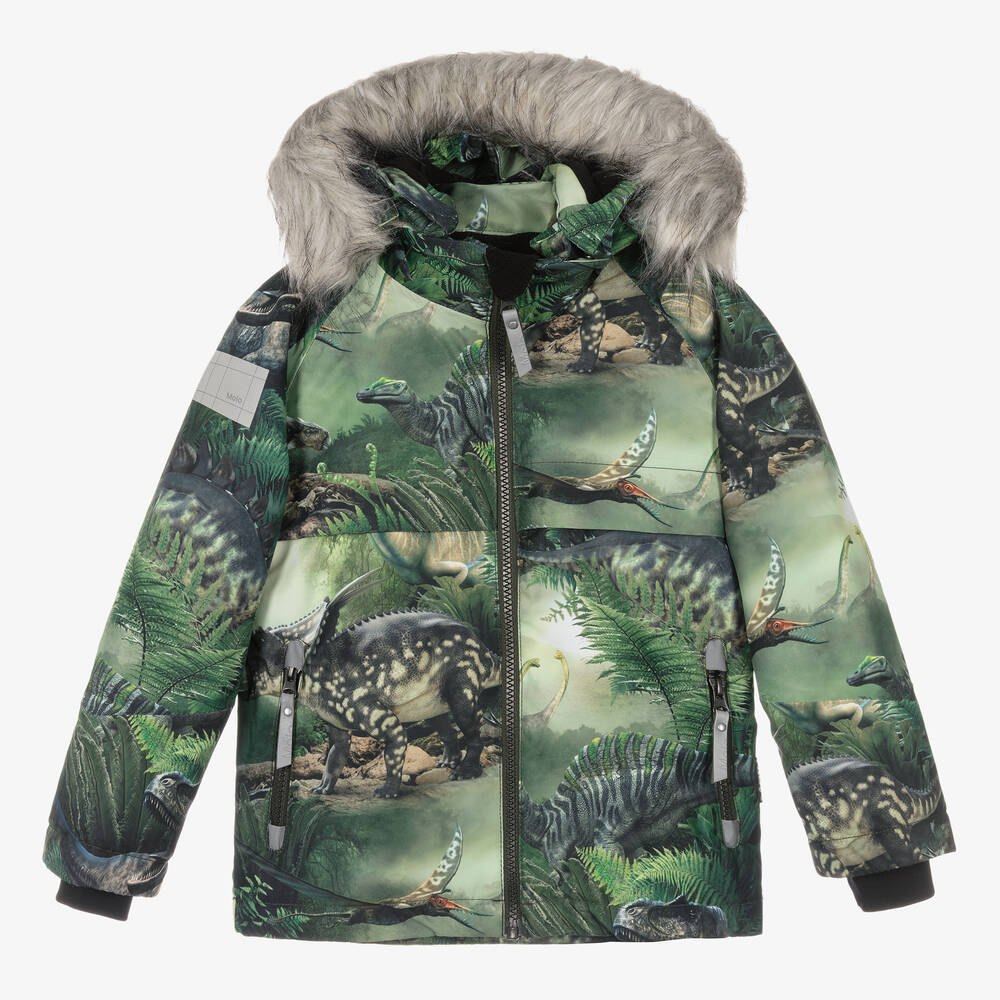 Boys green zip-up ski jacket by Molo, with an all-over dinosaur forest print. Made from recycled materials with 3M Thinsulate padding™ for warmth, it is breathable, waterproof and windproof. It has a cosy polar fleece lining and a removable hood with faux fur trim. To keep the snow and winter chills out, it has a toggle adjustable hem and ribbed black cuff inserts. For improved visibility, there are reflective prints and trims on black zipped pockets.