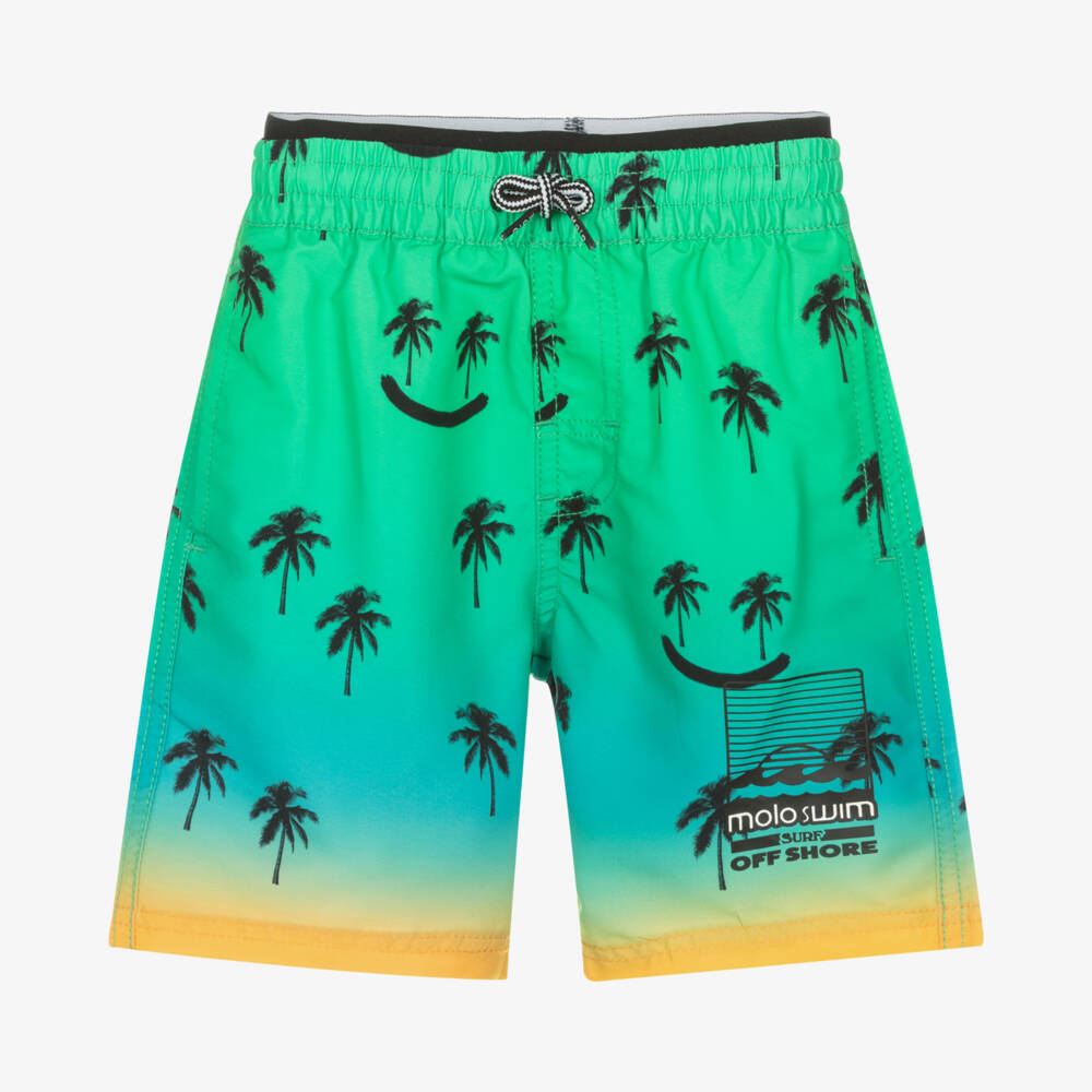 Cool green and orange gradient effect swim shorts for boys from Molo, with UPF 50+. Silky smooth and lined with soft mesh for added comfort, they have an internal elasticated waistband with an adjustable drawstring fastening for a secure fit. With discreet pockets on the side seams, they are printed with smiling black palm tree graphic along with a black surf-themed logo on one leg for an eye-catching finish.