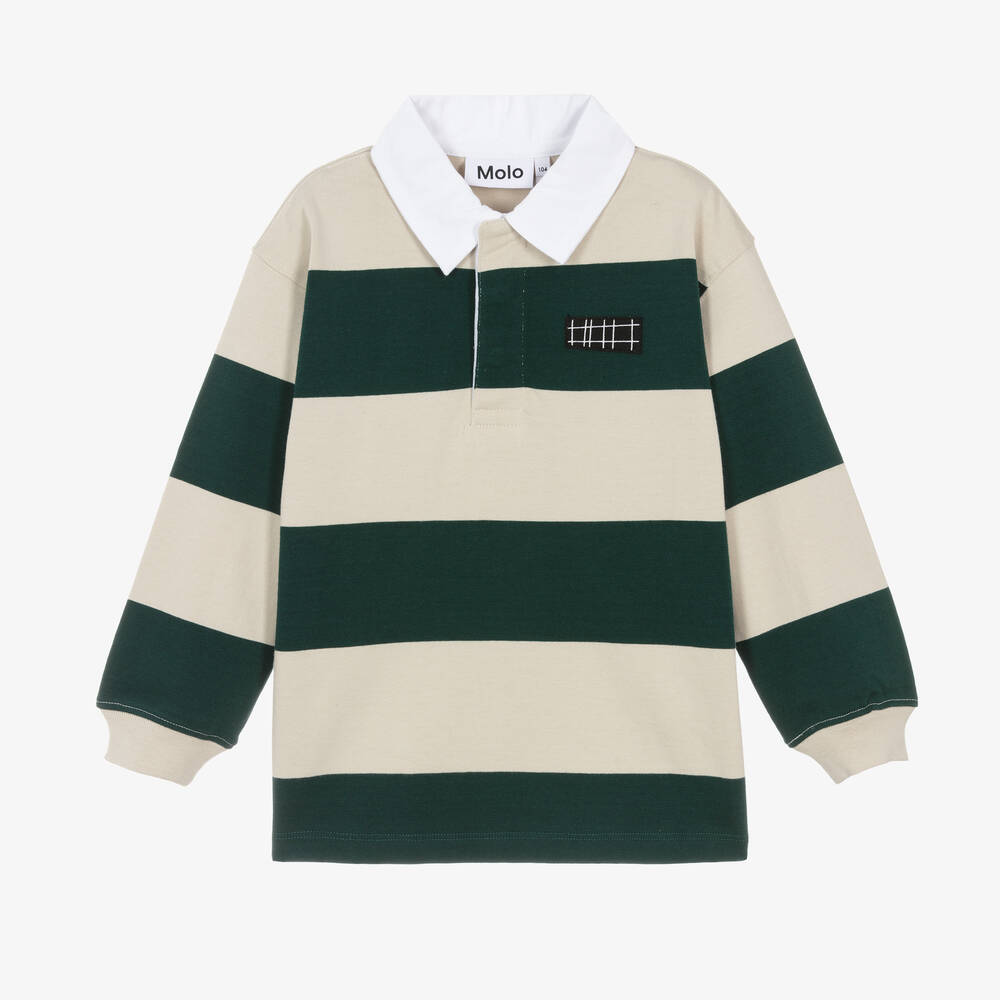 Dark green and beige striped rugby shirt for boys by Molo, made in soft organic cotton jersey. This classic, casual, long-sleeved style has a white twill collar, a concealed button placket and stretchy ribbed cuffs. The Danish brand's geometric logo patch can be seen on the chest.