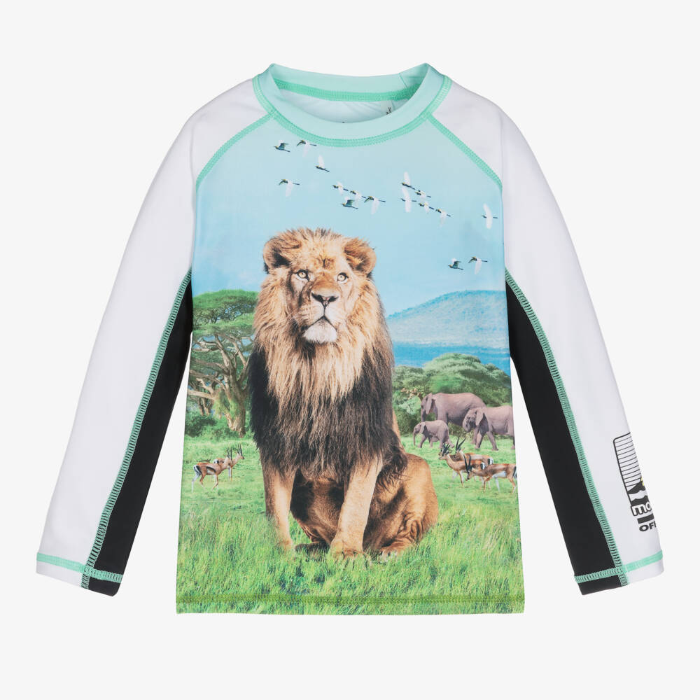 Quirky green UPF 50+ sun protective top for boys from Molo. Silky and stretchy, it is ideal for use in the pool or at the beach. To stand out from the crowd, it has a graphic print of a lion and other safari animals.