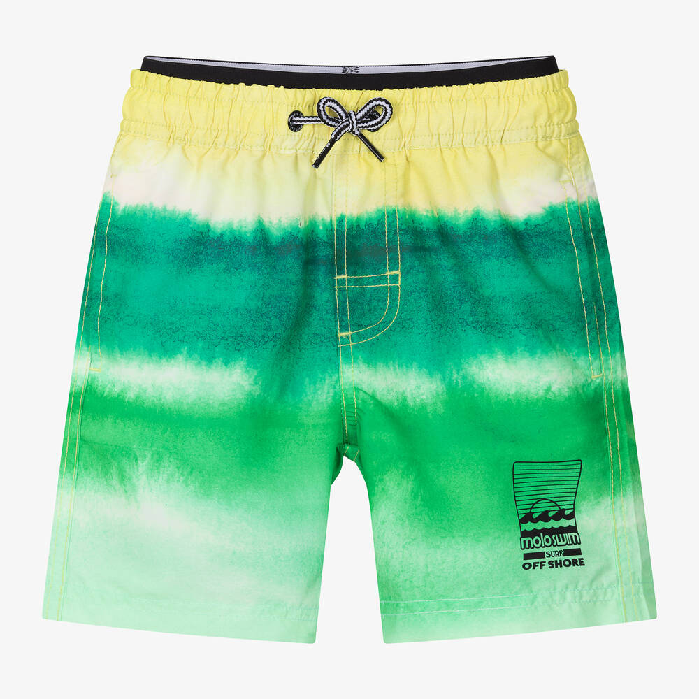 Green and yellow ombré swim shorts for boys by Danish brand Molo, made in soft, smooth, recycled materials with a UPF 50+ rating. The elasticated waistband has a drawstring tie for an adjustable fit, with a partly exposed, black stretchy band below that has a white wave design for a little designer style. They have useful side seam pockets and a faux back pocket, with a black logo printed on one leg. There is a mesh lining for comfort.