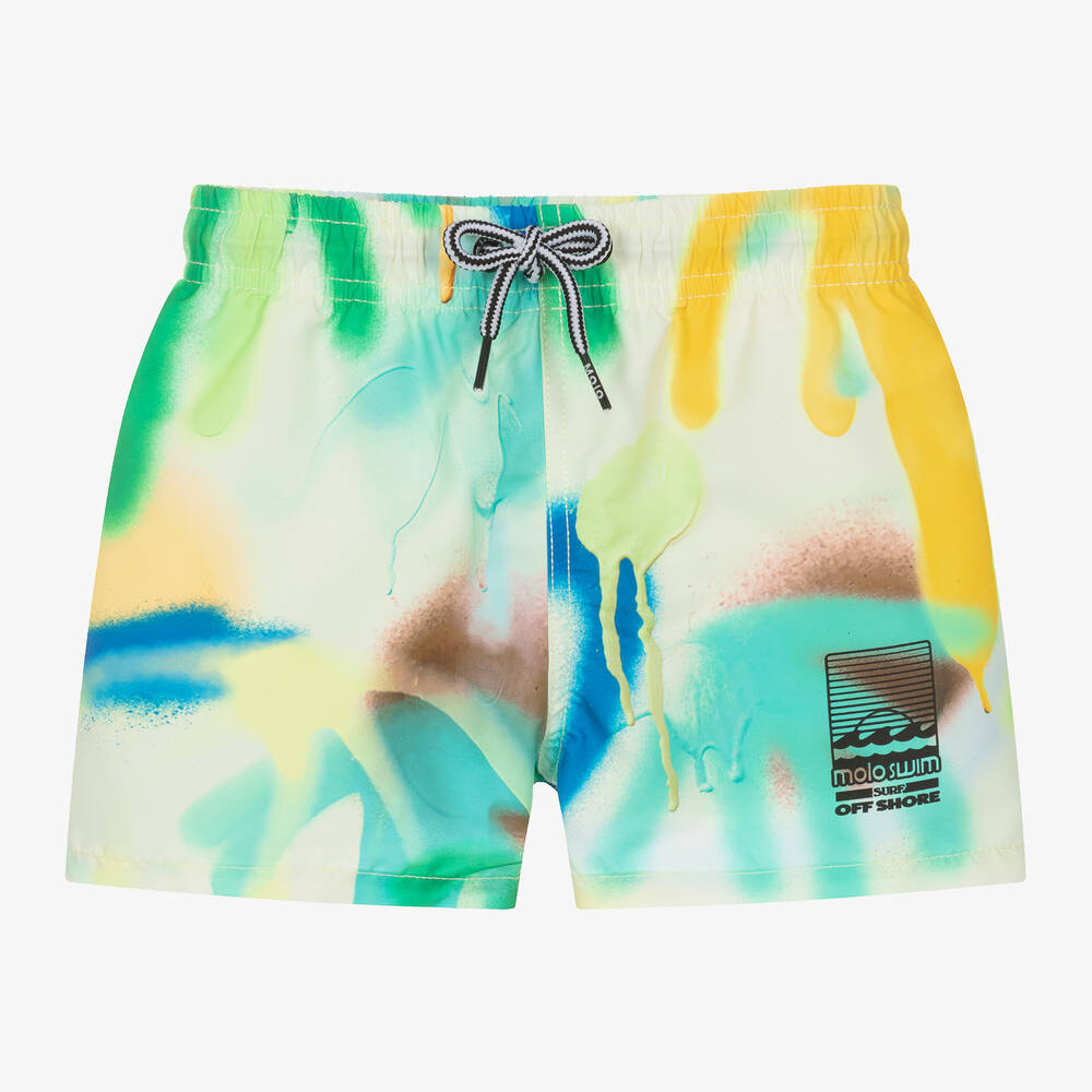 Green UPF50+ swim shorts for boys by Danish brand Molo, with a cool and colourful spray paint print. Silky smooth and lightweight, they are lined in soft mesh for comfort, with a drawstring waist for an adjustable fit and a faux pocket on the back. To complete the look, there is a surf-themed logo print in black on the front.