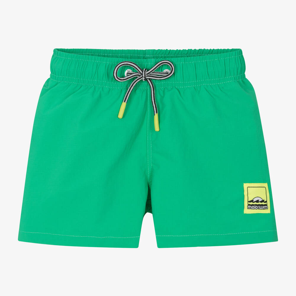 Bright green swim shorts for boys by Danish brand Molo, made in lightweight UPF50+ ripstop fabric, using recycled fibres. For comfortable wear, they have a soft mesh lining and an elasticated waistband with an adjustable drawstring and branded eyelets. There is a pocket on the back and a neon green logo patch on the front for a distinctive designer touch.
