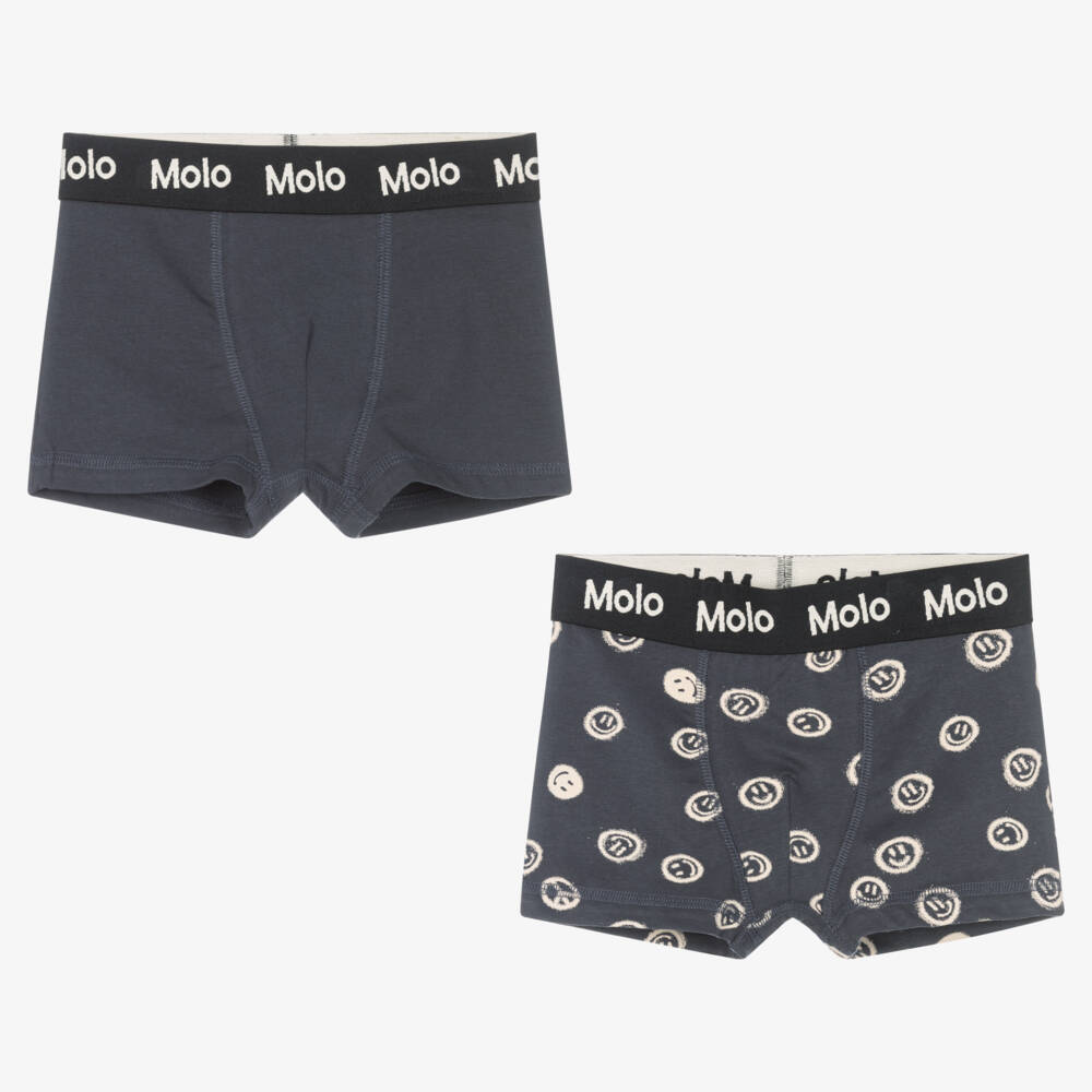 A pack of two boxer shorts for boys by Danish label Molo, in charcoal grey. Super comfortable, both pieces are made in soft and stretchy organic cotton jersey, with an elasticated jacquard-logo waistband. One pair is patterned with smiling faces and the second pair is plain.