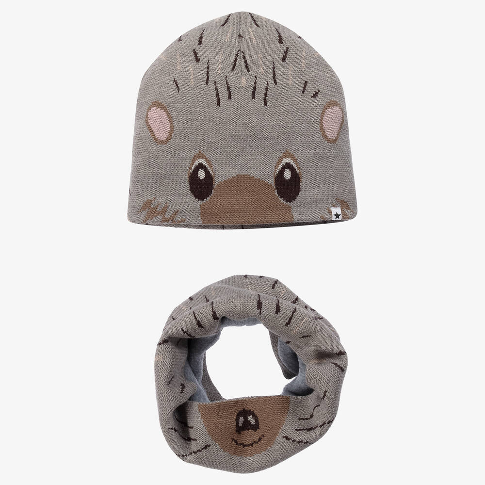 Boys grey beanie hat and snood set from Danish label Molo, knitted in a cosy wool blend. Creating a playful look, the set has a quirky hedgehog design in brown and beige. Both pieces have a soft polar fleece lining for extra warmth and a black and white star logo tab stitched on the side.