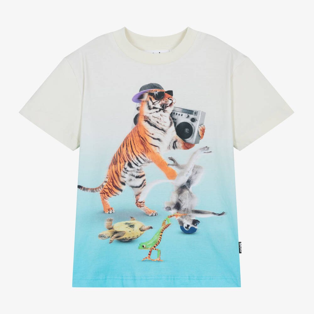 A fun ivory and blue short-sleeved T-shirt for boys by Molo, made in super soft organic cotton jersey. It has a vibrant jungle animal print with a breakdancing tiger and a rapping hamster printed on both sides for a playful look.