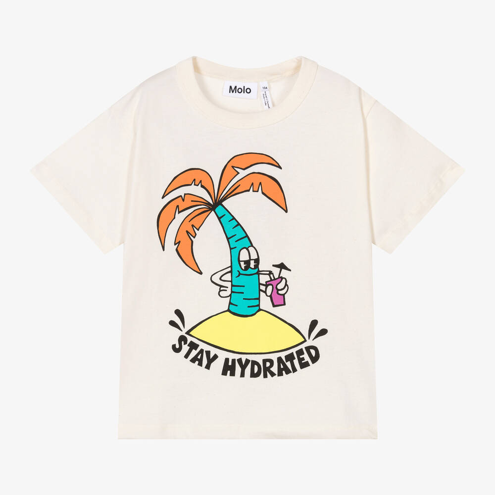 Ivory short-sleeved T-shirt for boys by Molo, made in soft organic cotton jersey. It has a 'Stay Hydrated' slogan printed on the front, alongside a fun palm tree character, for a happy look.