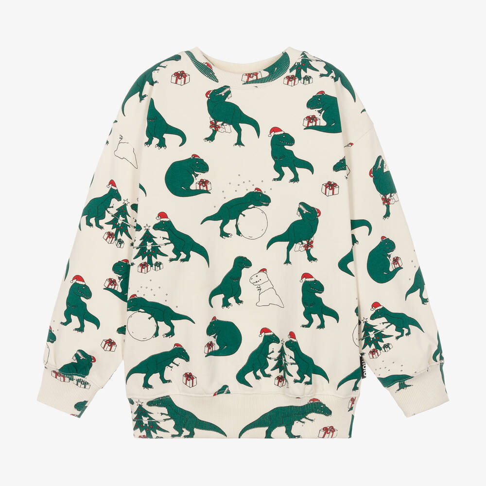 A fun ivory sweatshirt for boys by Danish brand Molo, with a festive dinosaur print in green and red. Designed with a relaxed, dropped shoulder fit, this casual long-sleeved top is made in comfortable organic cotton jersey with a cosy fleece feel inside.