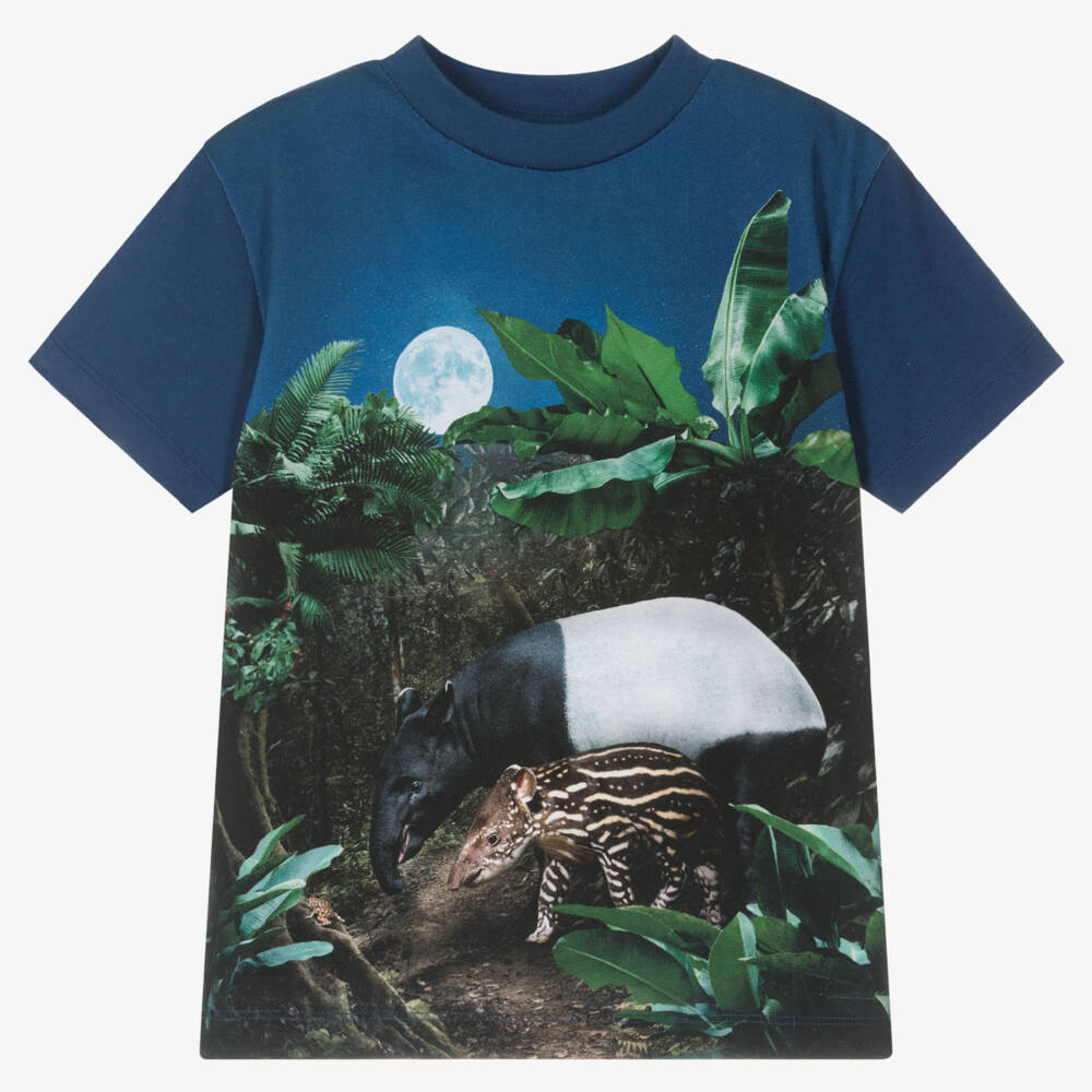 Boys navy blue T-shirt by Molo, patterned with a night-time stripy animal print in the jungle. It is made in soft organic cotton jersey and has a casual crew neckline.
