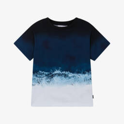 Navy blue organic cotton T-shirt for boys by Molo, with a cool ocean print in shades of blue and white. Casual and comfortable, this relaxed fit jersey tee has a crew neckline and short sleeves.